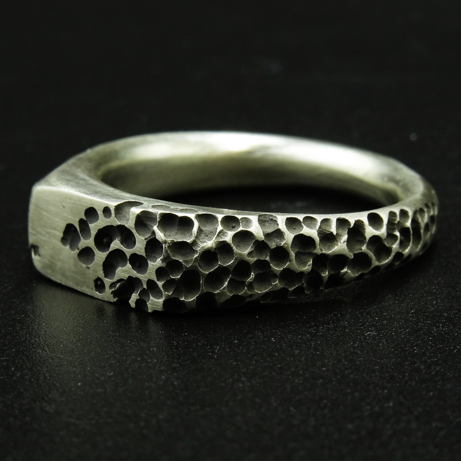 Marked by cratered textures and lunar scars, Crateris reflects the silent power of cosmic creation. Each hollow and indentation is a trace of elemental force — fire, stone, and time shaping silver into form. A ring that embodies both destruction and rebirth, it stands as a reminder that even within the deepest voids, new worlds are born.