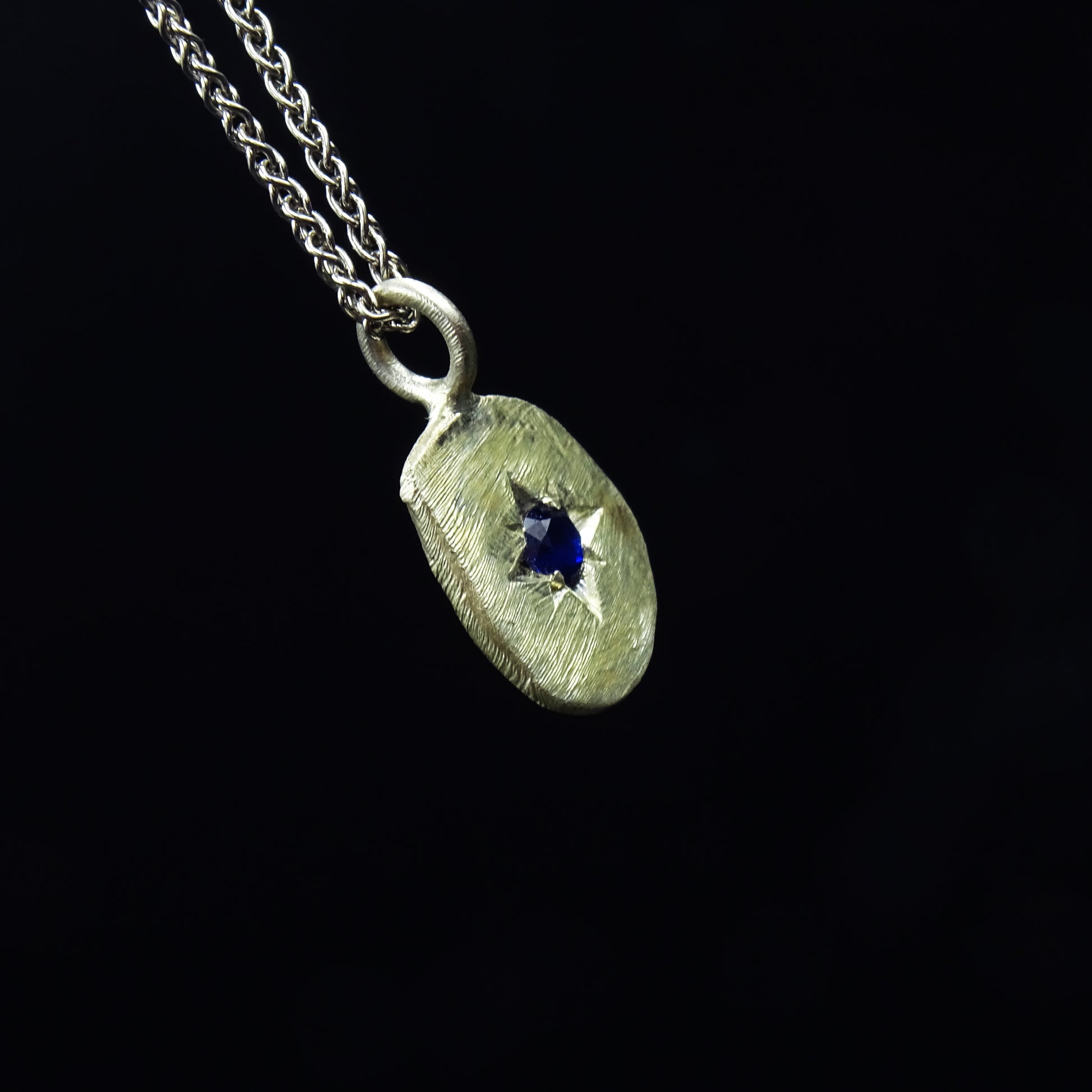 Dark and deliberate, Deepmark is a quiet imprint of the unknown. With a deep blue stone set into weathered silver, it evokes the depth of ocean trenches and the calm of a moonlit sky. Minimal yet commanding, this pendant is a symbol of still waters, hidden strength, and unspoken meaning.