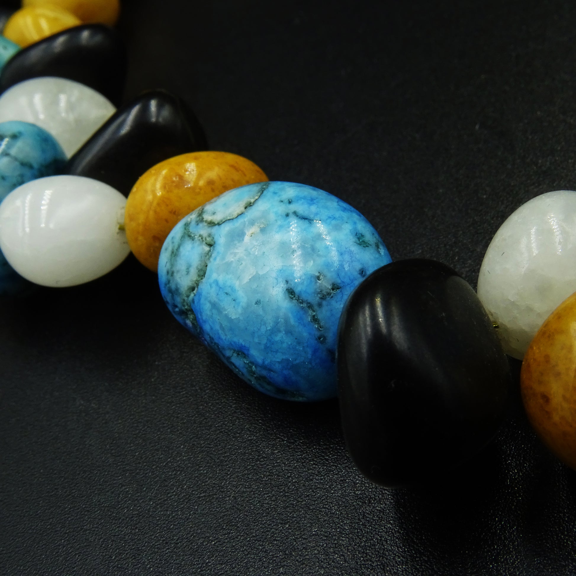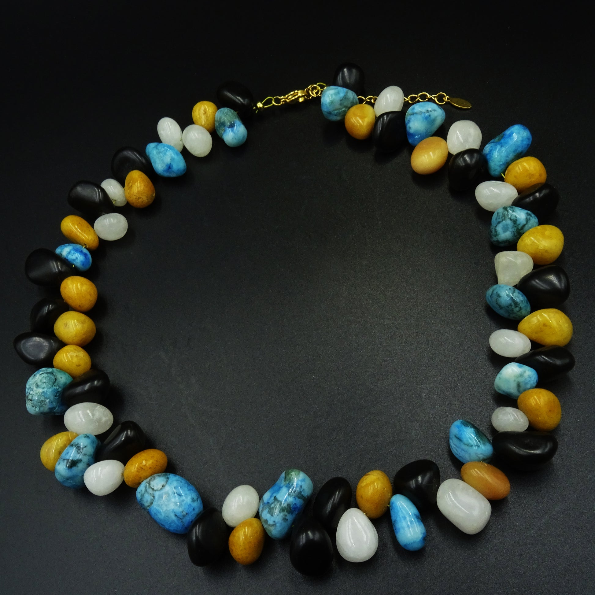 The Ocean's Mosaic necklace is a vibrant tribute to the sea, weaving together shades of blue, white, yellow, and black gemstones. Each stone mirrors a fragment of the ocean’s depths, sandy shores, and darkened tides, creating a harmonious blend that captures the essence of coastal beauty. Finished with gold-plated accents, this piece is both refreshing and timeless.