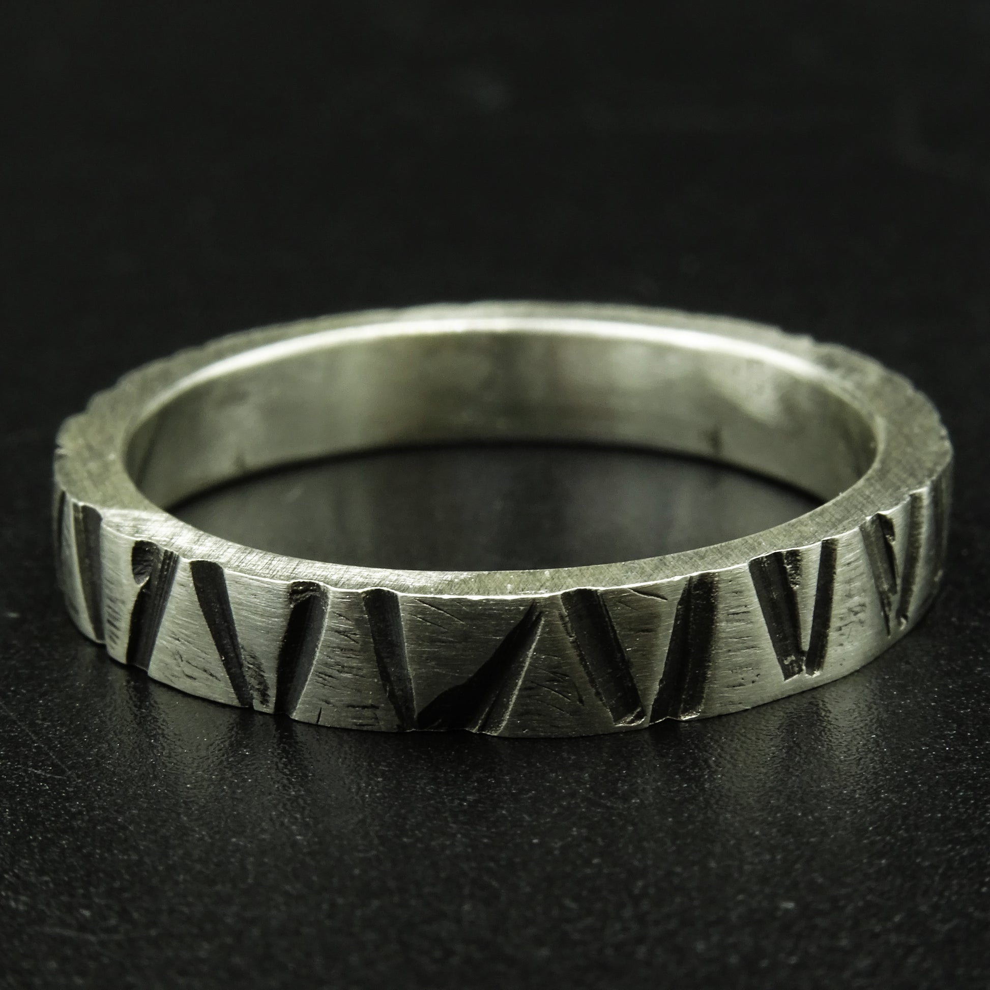 A handcrafted 950 silver ring featuring diagonal engraved lines that repeat around the band. The textured cuts create a unique rhythmic pattern, symbolizing cycles of memory and personal growth. Durable, minimalistic, and perfect for everyday wear.