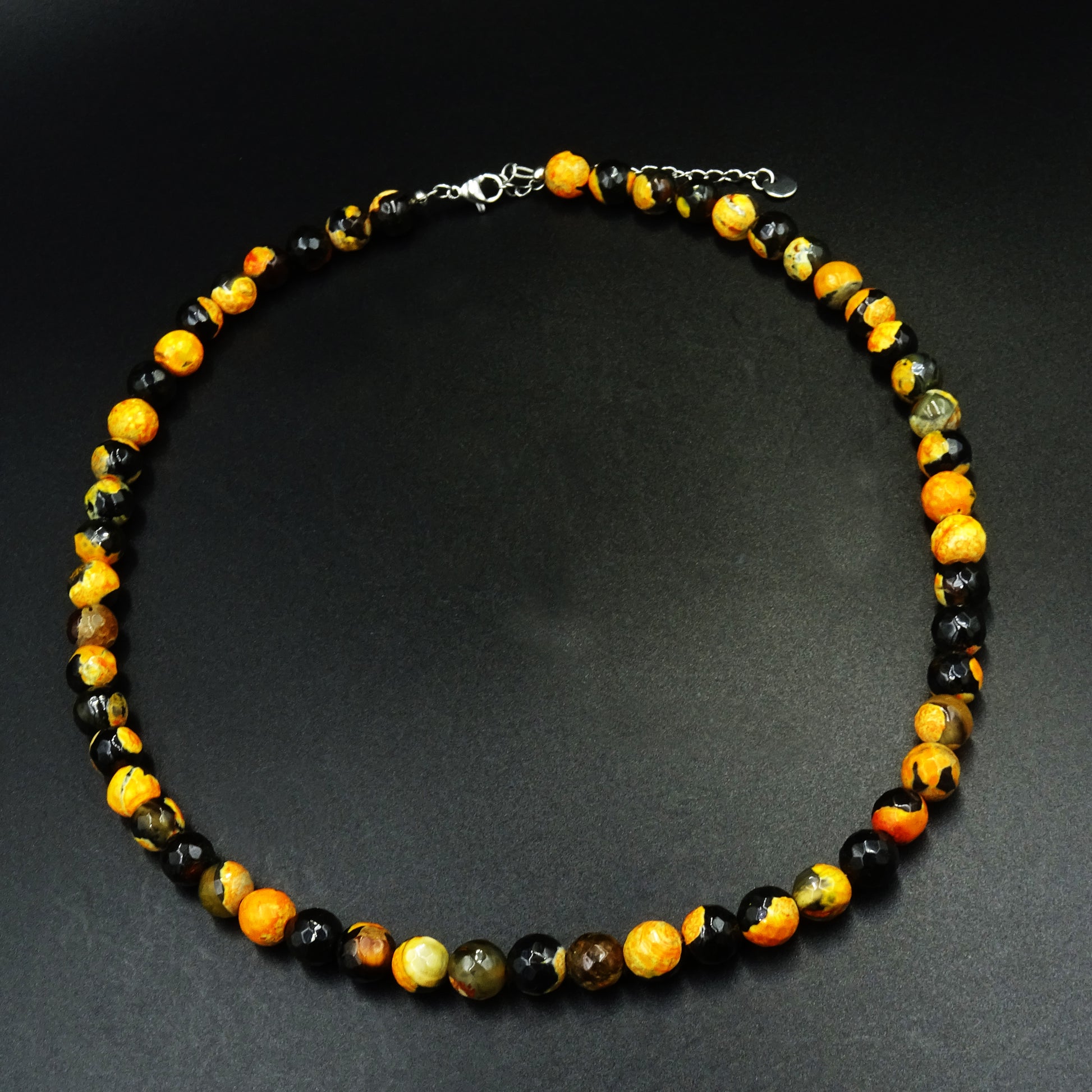 A vivid interplay of deep black, burnt orange, and golden yellow faceted agate gemstone beads, Solar Veins channels the raw power of volcanic energy coursing through stone. Each bead is a flicker of fire captured in crystal form — bold, primal, and unforgettable.