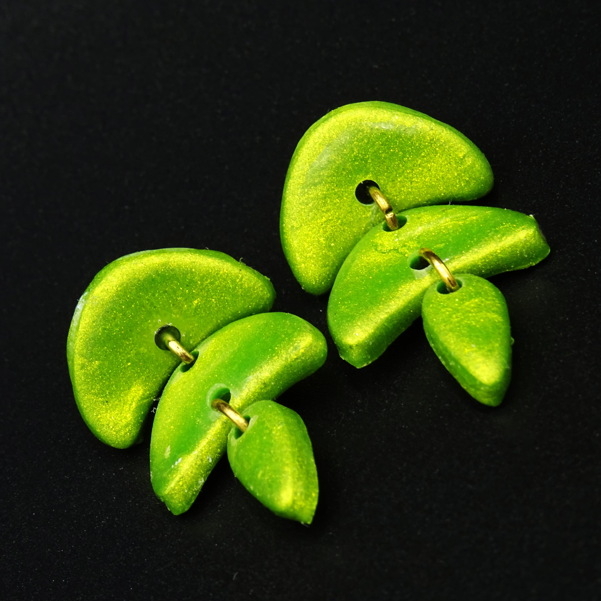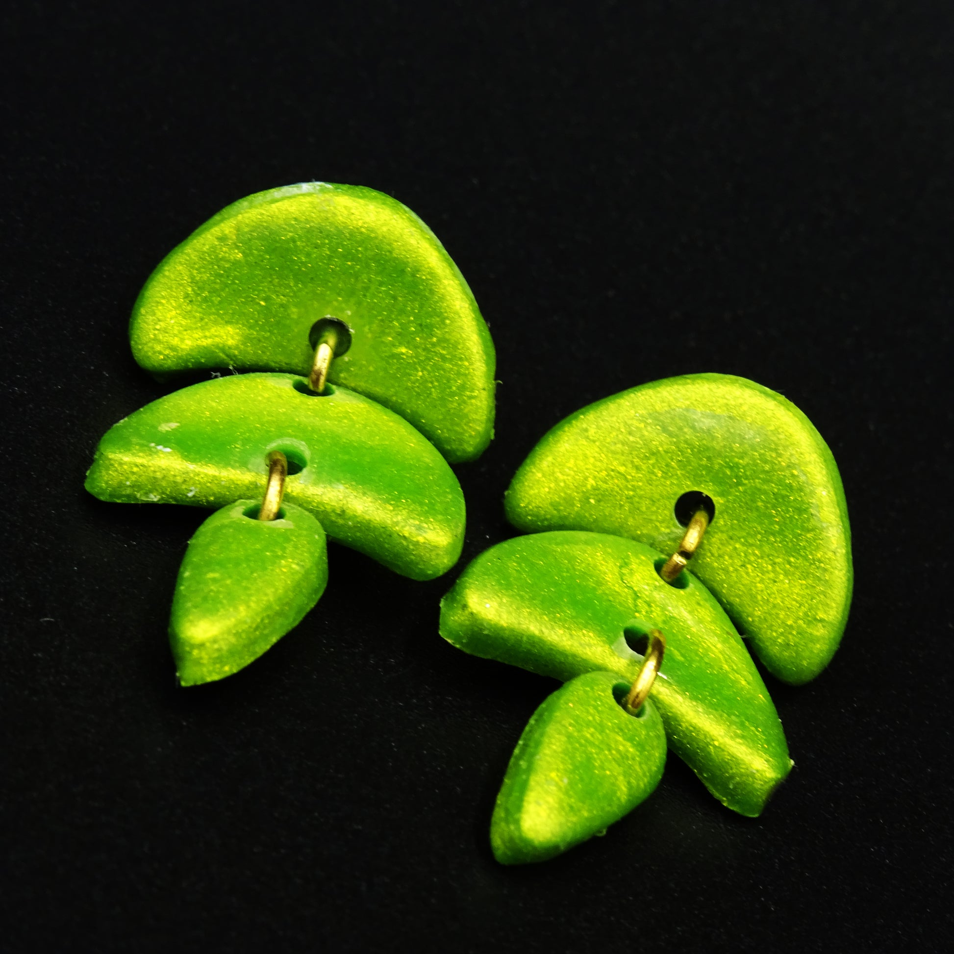 Playful and nature-inspired, Verdant Harmony is a lively expression of organic movement and color. These dangling polymer clay earrings feature stacked crescent shapes in a vibrant green hue, connected with delicate stainless steel links. Their lightweight feel and dynamic design make them an eye-catching piece for everyday wear.