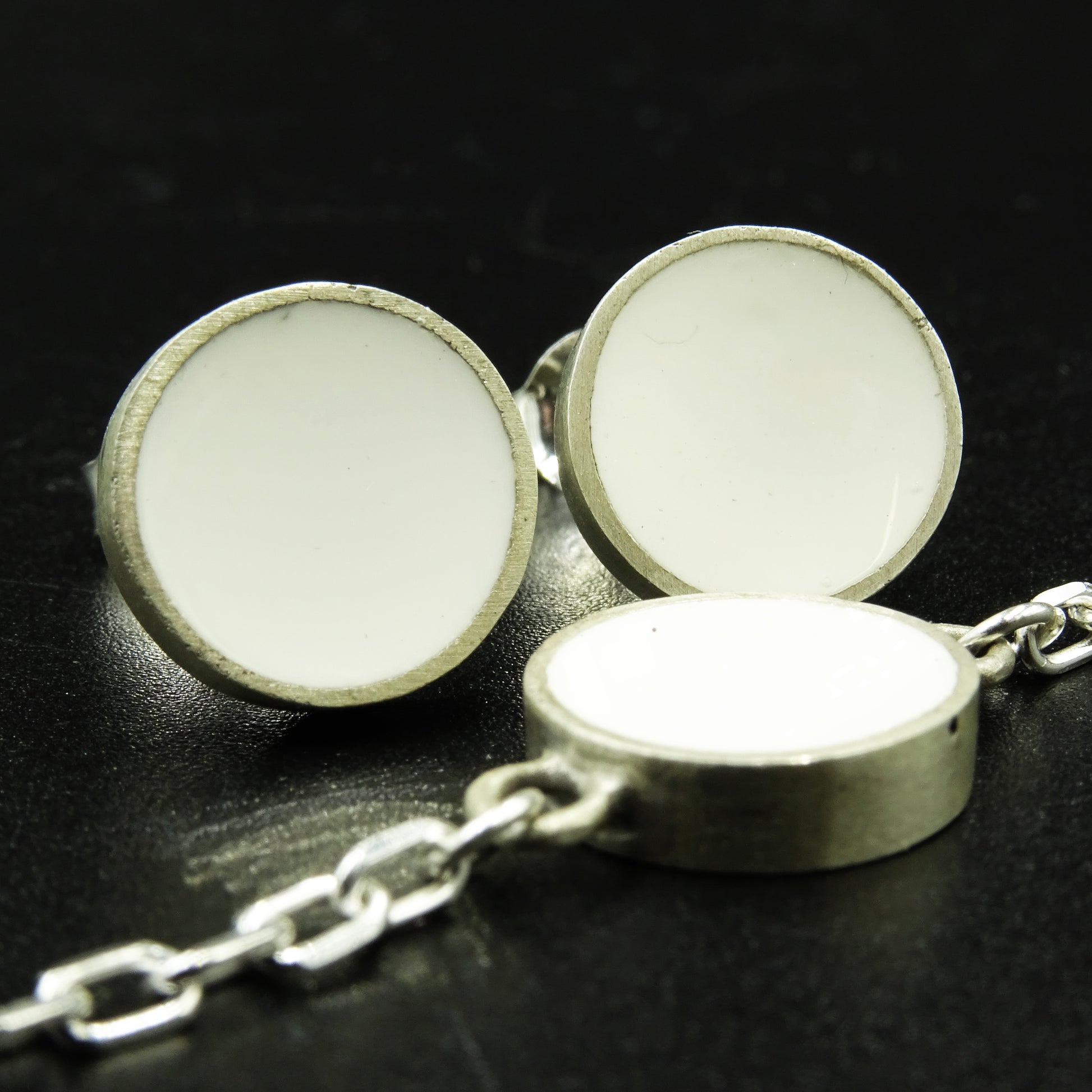 White Halo is a crisp white-enamel and 950 silver jewellery set crafted with minimalist elegance. The 11 mm enamel circle offers a clean and timeless look suitable for every style. Ideal for those searching for minimalist white earrings, enamel accessories, and artisan silver jewellery.